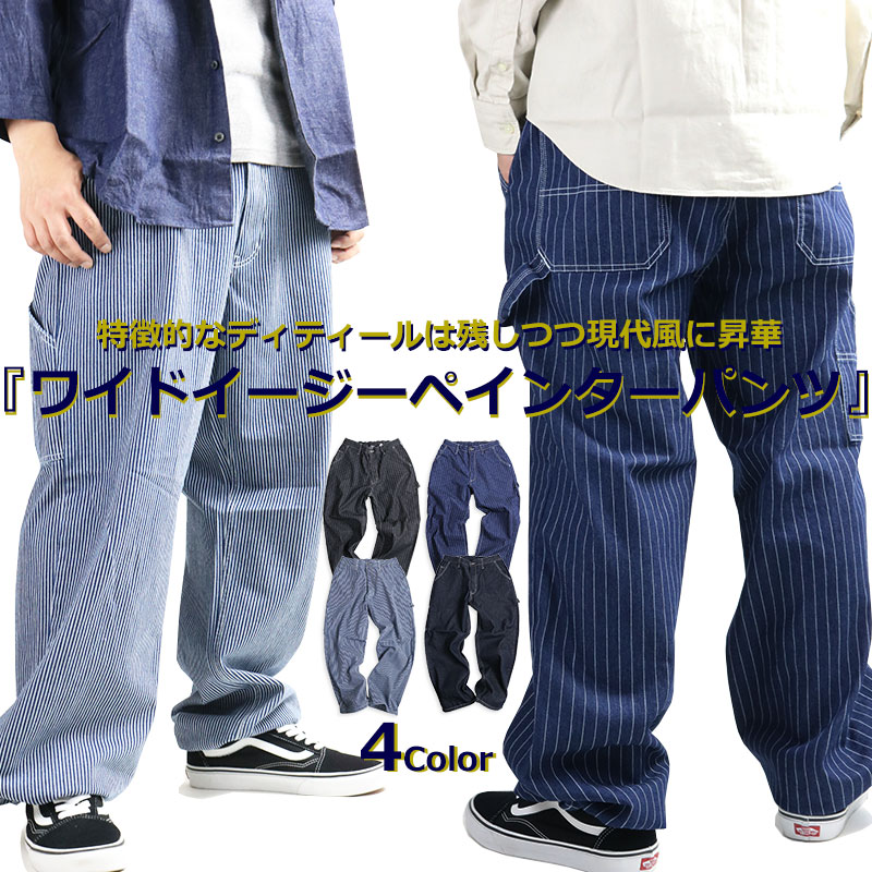 ペインターパンツ メンズ ワークパンツ ワイドパンツ 作業着 仕事着 デニム インディゴ ブルー ネイビー ブラック ヒッコリー ストライプ アメカジ 爆買