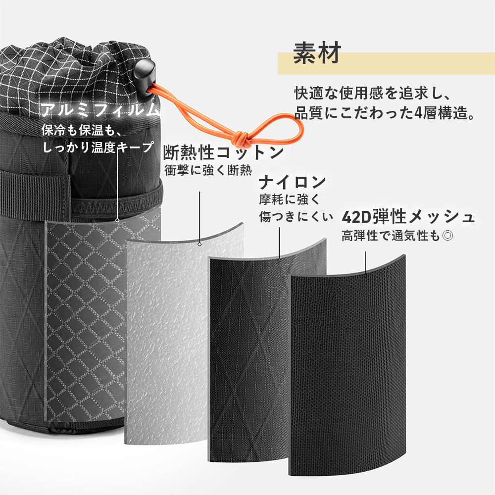 断熱アルミフィルムを採用し、夏は冷たく・冬は温かくキープ!ドリンクや軽食の持ち運びに最適です。