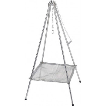 ダッチオーブン25cmや鍋が吊るせて、吊り下げ位置が自由に変えられる自在チェーンが付いています。メッシュベースを外せば、小型グリル用の四脚スタンドとしても使えます。丸めてコンパクト収納が可能です。