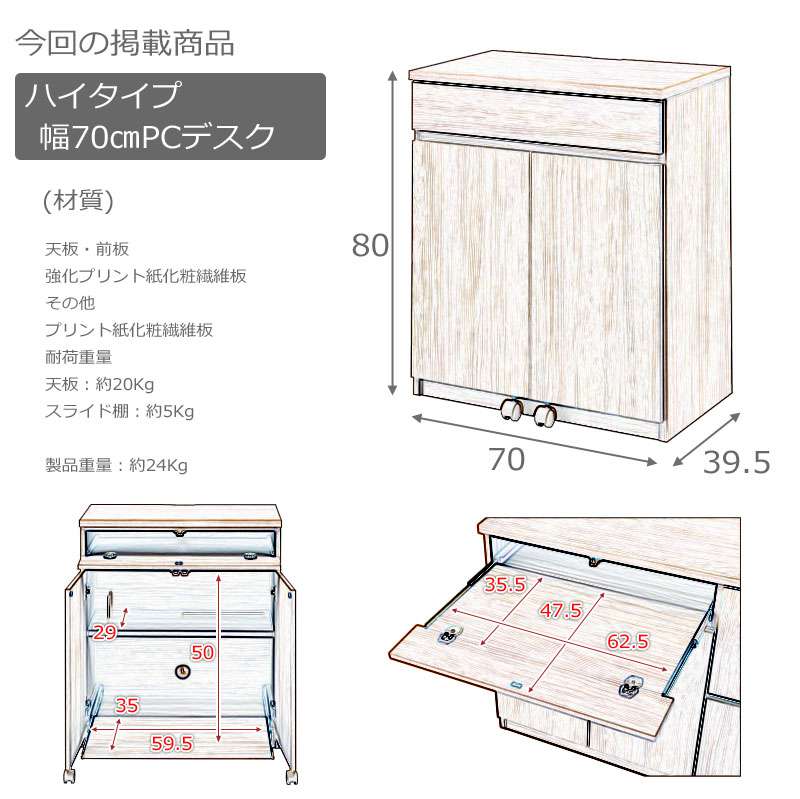 パソコンデスク デスク 幅70 収納 おしゃれ 完成品 日本製 スリム ハイタイプ 机 プリンター収納 パソコン PCデスク 折りたたみ キャビネット ホワイト