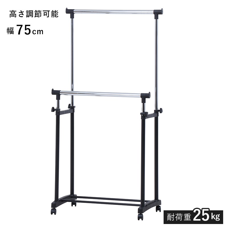 パイプハンガー ダブル 2段 ハンガーラック 頑丈 スリム キャスター 省スペース コートハンガー 幅75 高さ調整 二列 パイプ キャスター付き コート掛け