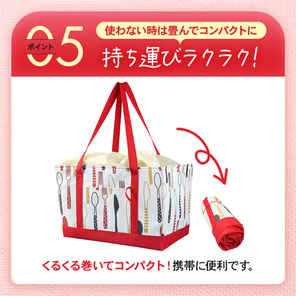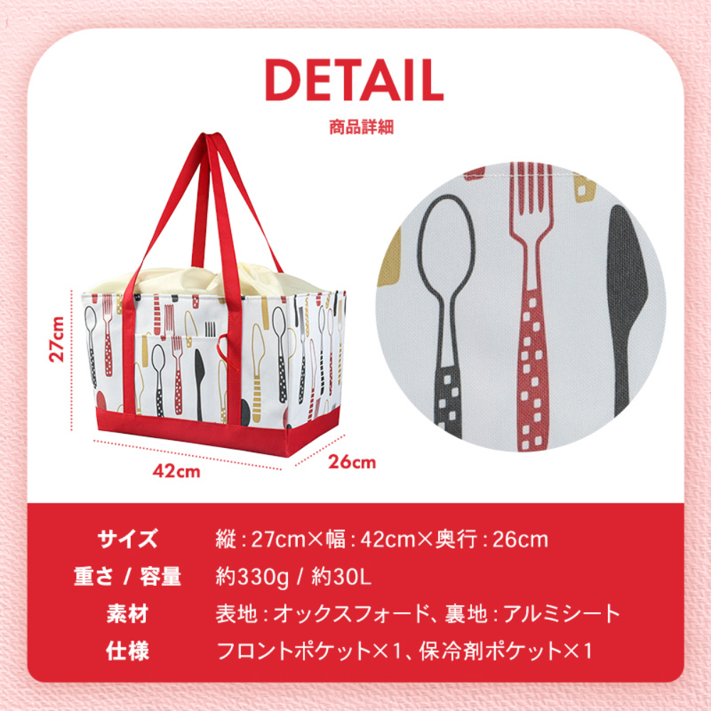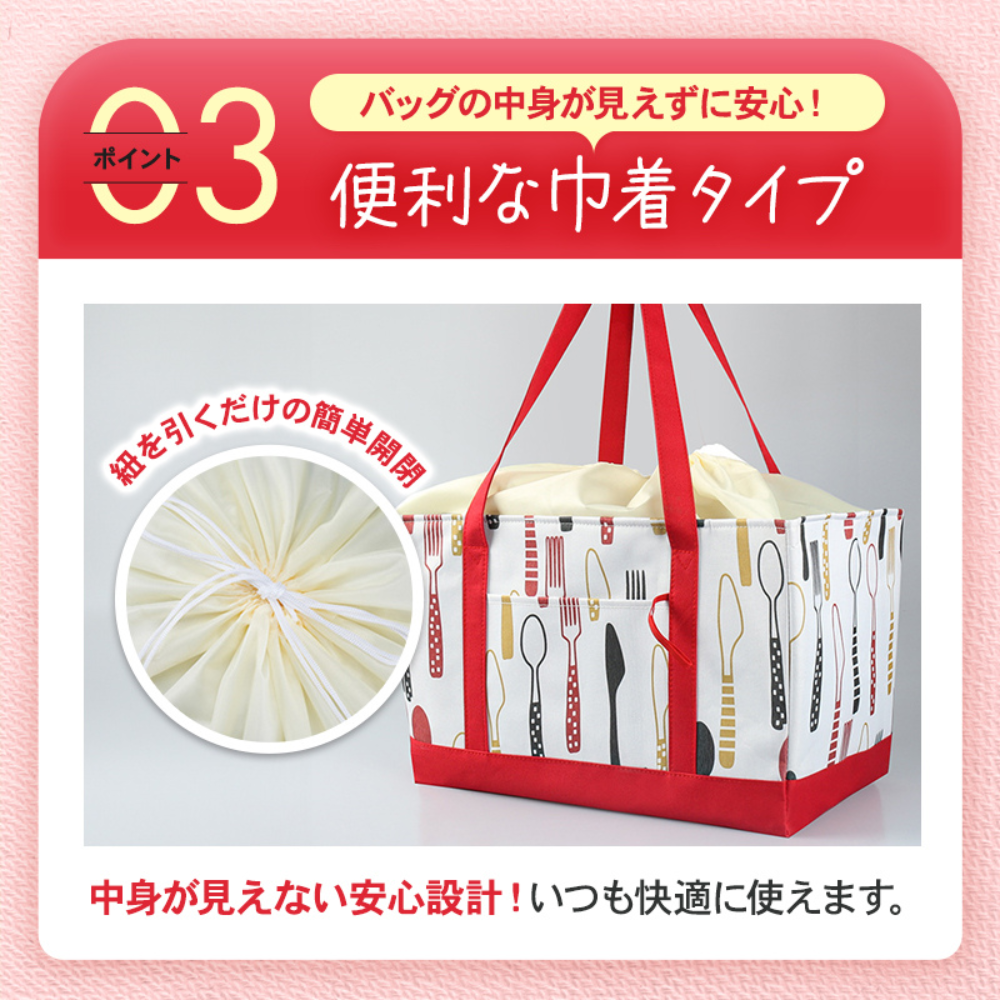 商品名:エコバッグ レジカゴ おしゃれ 大容量 折りたたみ 保冷 ポケット 丈夫 大きめ 保温 布 マチ広 アルミ 自立 赤 水玉 巾着 30l