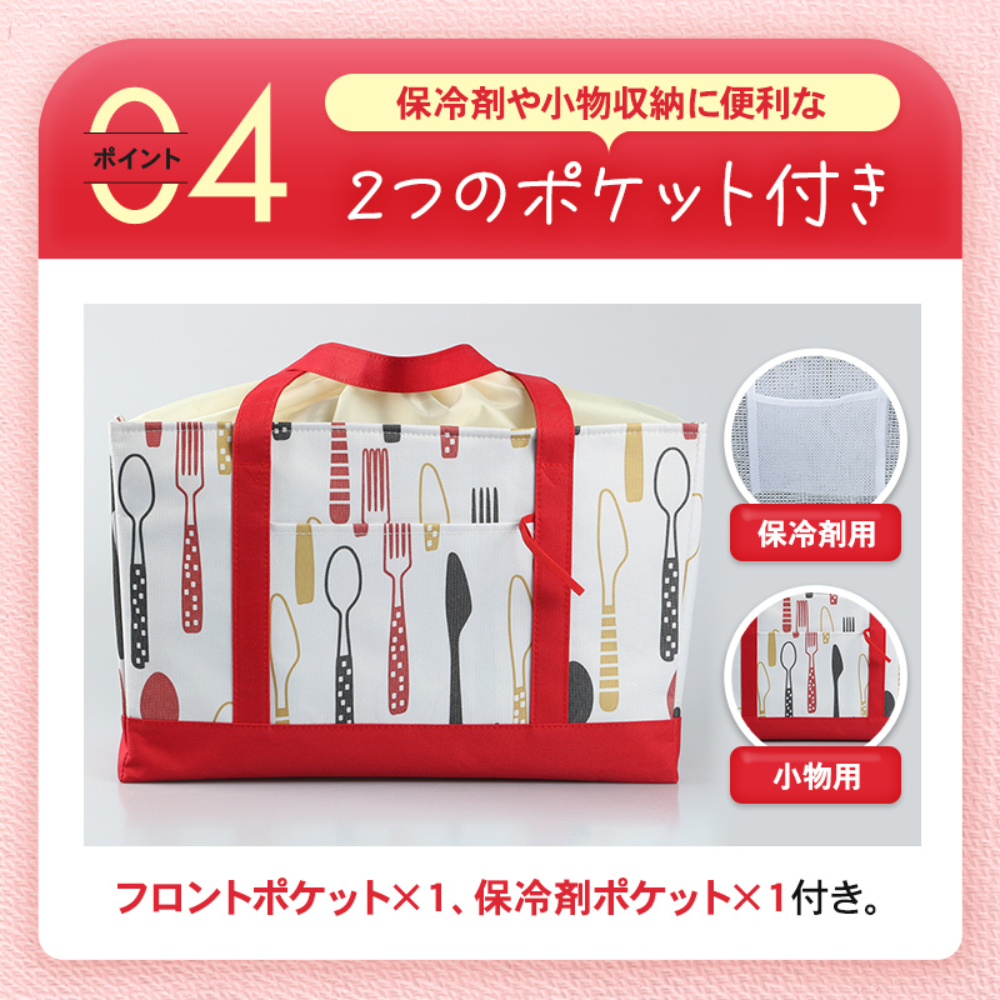 仕様:フロントポケット×1、保冷剤ポケット×1