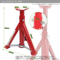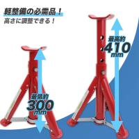 車をジャッキアップして整備を行う場合の必需品!ジャッキで車を持ち上げるだけで整備をするのは不安定で大変危険です。そんな時に必要不可欠なのがジャッキスタンドです!高さ調整も簡単でしっかり車体を固定します。折りたたみ式で持ち運びにも便利! 耐荷重:3t (2基使用)最低位:300mm最高位:410mm高さ調整:4段階(ピン式)