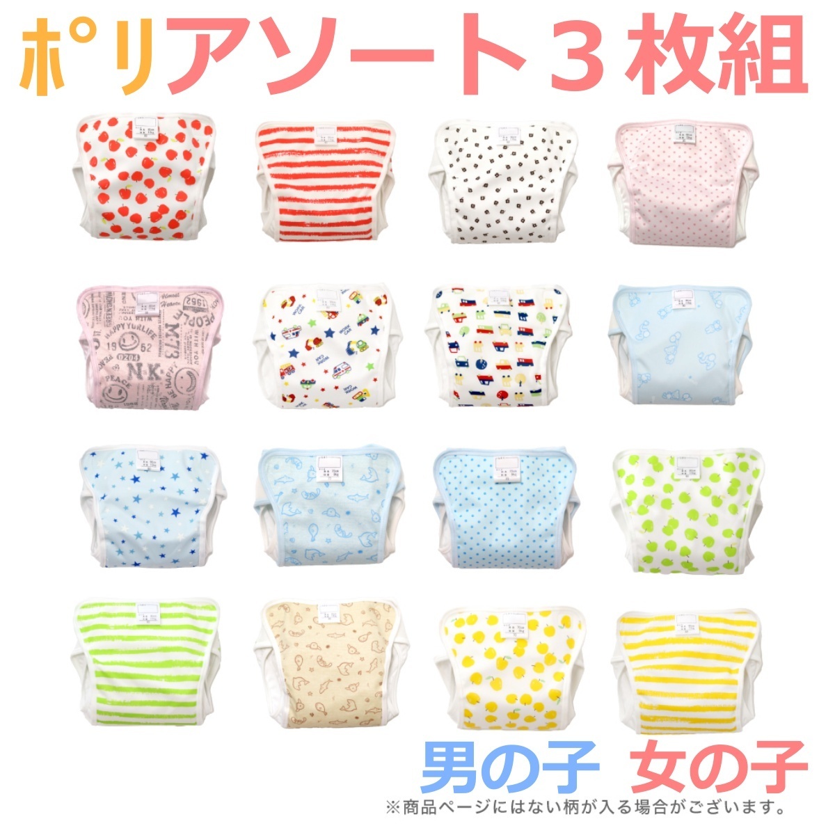 男の子用 女の子用 ポリエステル100% おむつカバー3枚アソートセット 内ベルトタイプ