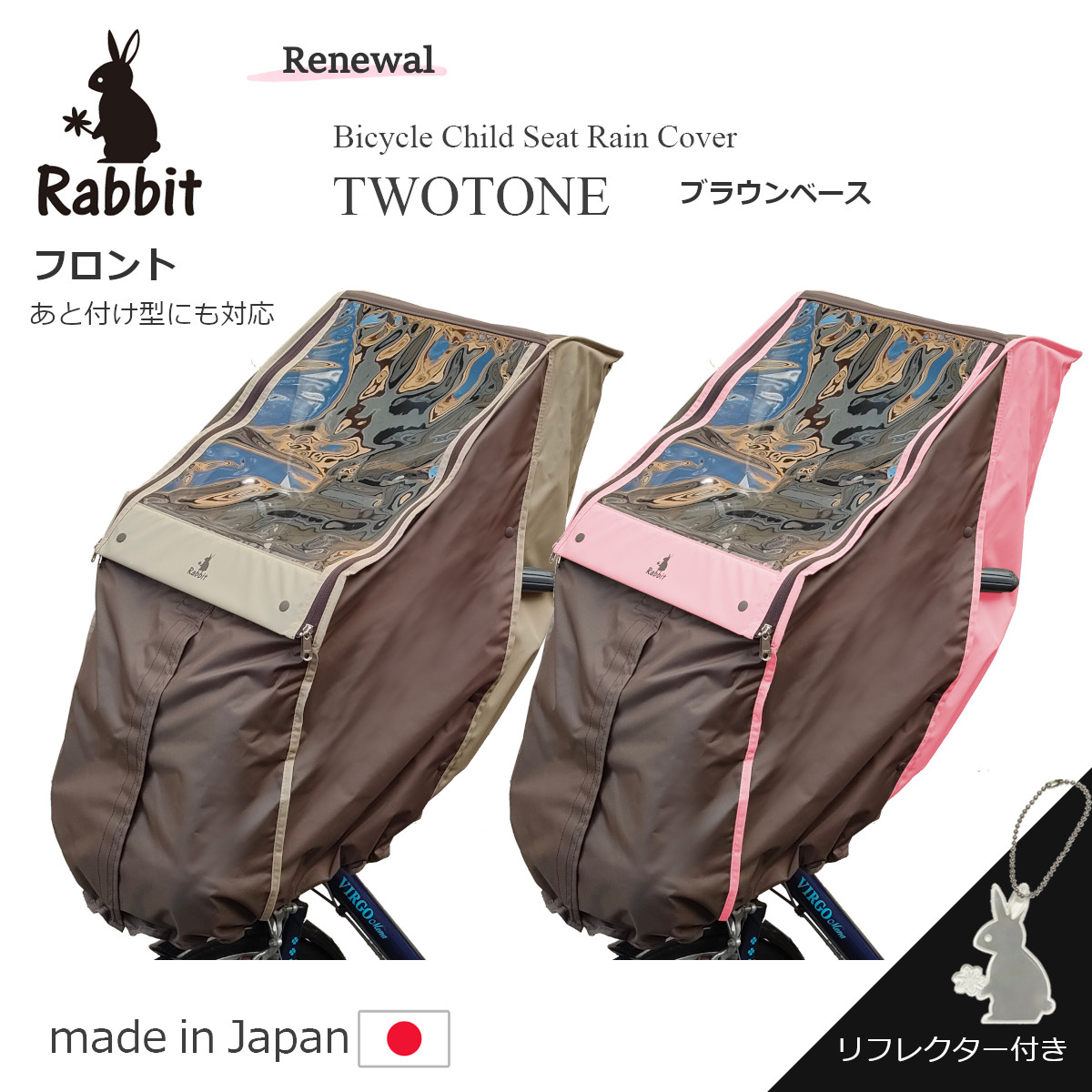 ラビットの自転車 レインカバー 前用は、ハンドル一体型/あと付け型、2種類のチャイルドシートに対応します。