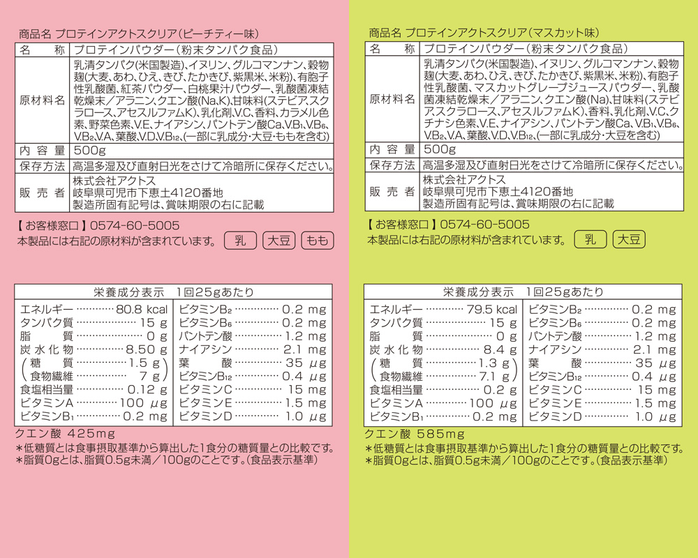 プロテインアクトスクリア 約20回分 (500g) アクトスオリジナルサプリメント ホエイプロテイン WPI ピーチティー味 マスカット味