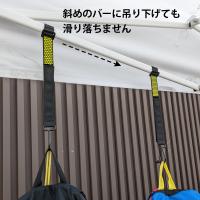 ワンタッチテントはフレームが斜めになっているので、滑り止めがないと、吊り下げた荷物がズリ落ちてしまいますが、このハンガーフックは強力な滑り止めがあり、フレーム上に均等に荷物を吊るせます。