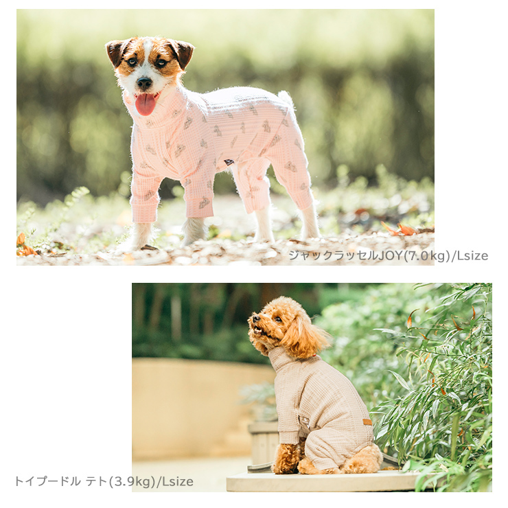 またワンちゃんの体格(腕や足の長さや太さ、胸の張りなど)や毛量の影響でお洋服によって着脱のしやすさや着用感に差が出る場合がございます。その旨ご留意いただけますようお願いいたします。