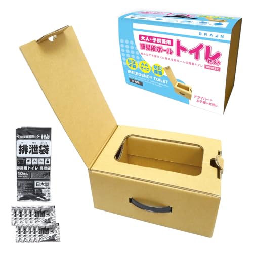 ・● 水が使えない状況でも簡易段ボールに排泄袋をかぶせて、用を足した後に凝固剤をふりかけるだけ。ジェル状に固まりゴミとして廃棄可能です。 ● 凝固剤は1回分ずつアルミパックで密封されているので、開封しない限りそれぞれ長期の保存が可能です。常温未開封未使用で10年保存 ● 銀を配合しているので抗菌作用があり、感染症の原因となる大腸菌や黄色ブドウ球菌の繁殖を抑えます。大阪市立工業研究所の抗菌力試験でも抗菌力が認められました。 ● ヤシ殻活性炭を配合。消臭効果があり快適に使用できます。(財)日本食品分析センターの試験でも消臭効果が認められました。 ● 公的機関で各種性能検査テスト済み。抗菌力、消臭力、焼却残渣、急性経口毒性、皮膚一次刺激性のテストを実施済みです。 ● 1回に凝固剤を1袋ご使用下さい。 ● 段ボール製の簡易非常用トイレに、凝固剤10回分と、排泄袋10枚のセットです。