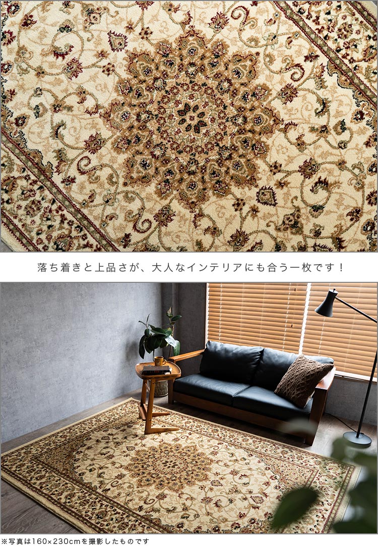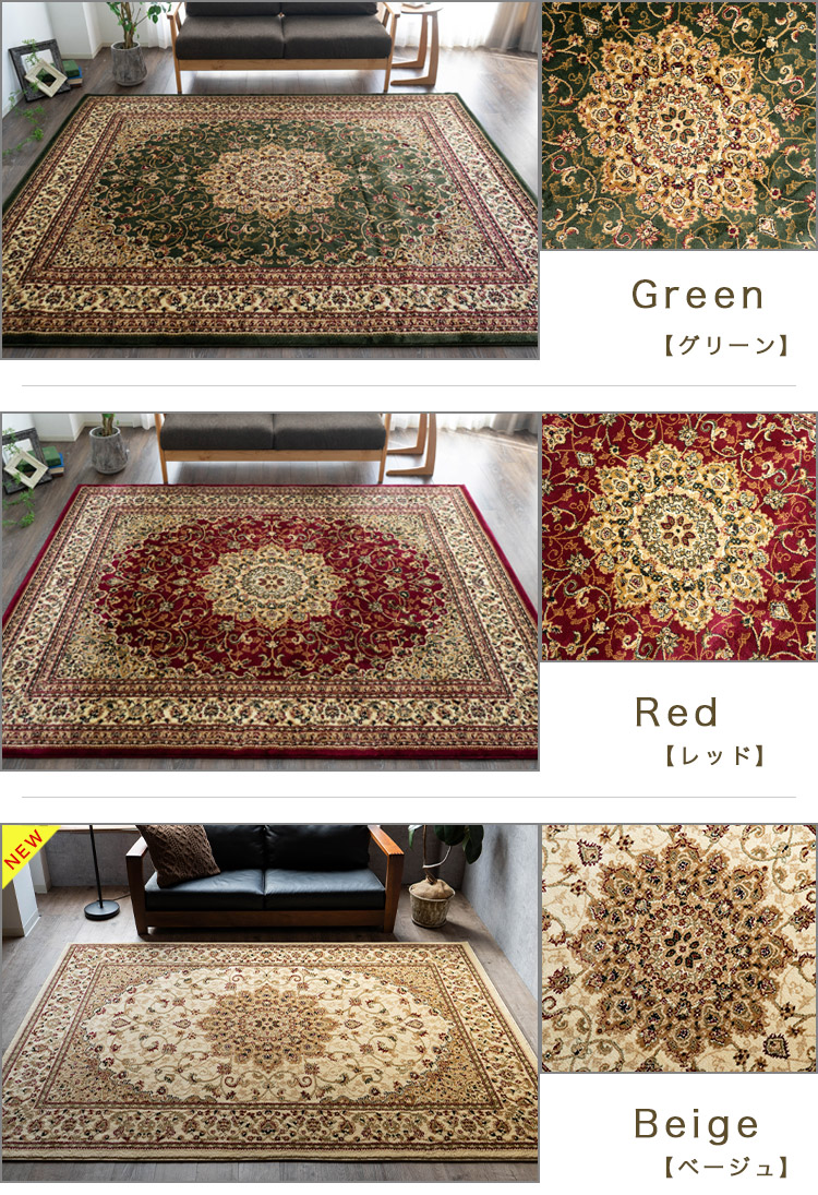 "見た目は豪華で、価格はお手頃" ペルシャ絨毯で代表的な クラシック・メダリオン柄 お手軽にお使いいただける、高級感ある ウィルトン織りカーペットです。 サイズ 200x250 cm (約3畳サイズ) ![]() トルコ製『ウィルトン織り』カーペット 伝統的なペルシャデザイン 「メダリオン・デザイン」 メダリオンの豪華に見えるデザインは、 高級感ある色使いです。 是非、一度手にとってご覧いただきたい カーペットです。 カラー: グリーン ![]() " 織りの密度は128,000ノット " ウィルトン織りカーペットの中では、お手軽な カーペットになります。 素材には(ポリプロピレン:100%)を使用。 繊維にはヒートセット加工を施しているので、 肌触りが気持ちよく仕上がっています。 さらにヒートセット加工の特徴として繊維に 熱処理加工を施すことから、形態や寸法安定性を 保つようにする効果もあり、表面が柔らかく、 滑らかで、遊び毛が出にくい仕上がりに、 なっているのも特徴です! ![]() "高級感ある上品で豪華な色使い" 上品な淡いベージュ色を使い、曲線までを 細かく織り込み丁寧にデザインを表現しています。 ![]() ![]() "一年を通して、お使いいただける絨毯" カーペットの厚みは、約10〜11mmの厚みです。 パイル長は、約9mmで細めのパイルを使用して いますので、それほど厚みを感じる タイプではありません。 さらに冬場には床暖房やホットカーペットカバーにも お使いいただけ、暖かい季節には、肌触りもよく、 とても心地良いカーペットです! ![]() お部屋をお手軽に模様替え ![]() カラー: レッド ![]() 深みのある落ち着いたお色の"レッド" 要所要所の細かな柄には、多色の色糸を 使用したりと、濃い色と薄い色のコントラスが 鮮やかな表情で、非常に綺麗に仕上がっています。 ![]() レッドとベージュのお色の組み合わせが、高級感を演出 ![]() ![]() お手入れ方法 ![]() カラー: ベージュ ![]() 伝統あるデザインを明るめの色合いで表現した"ベージュ" ペルシャ柄に優しいベージュカラーを組み合わせることで、 主張しすぎず、落ち着いたデザインになっています。 ![]() ![]() ![]() ![]() 選べる3色展開 多色の色糸を使った『トルコ製 ウィルトン織り』カーペット。 インテリアに合わせてお選びください。 ![]() "見た目は豪華で、価格はお手頃!" コストパフォーマンスの、とても高いカーペットです。 伝統ある『ウィルトン織り・ラグ』の良さを 感じていただけましたでしょうか? リビングマットとしてはもちろん、耐久性もあり、 サイズは200×250cm (約3畳サイズ) ※表示サイズより数cmの誤差がある場合がございますので、ご了承ください。 ※当店は通常、おもに同業他社に卸販売を行っております。 在庫は豊富にご用意しておりますが、突然の品切れの場合もございますのでその際はメールにてご連絡させていただきます。 |