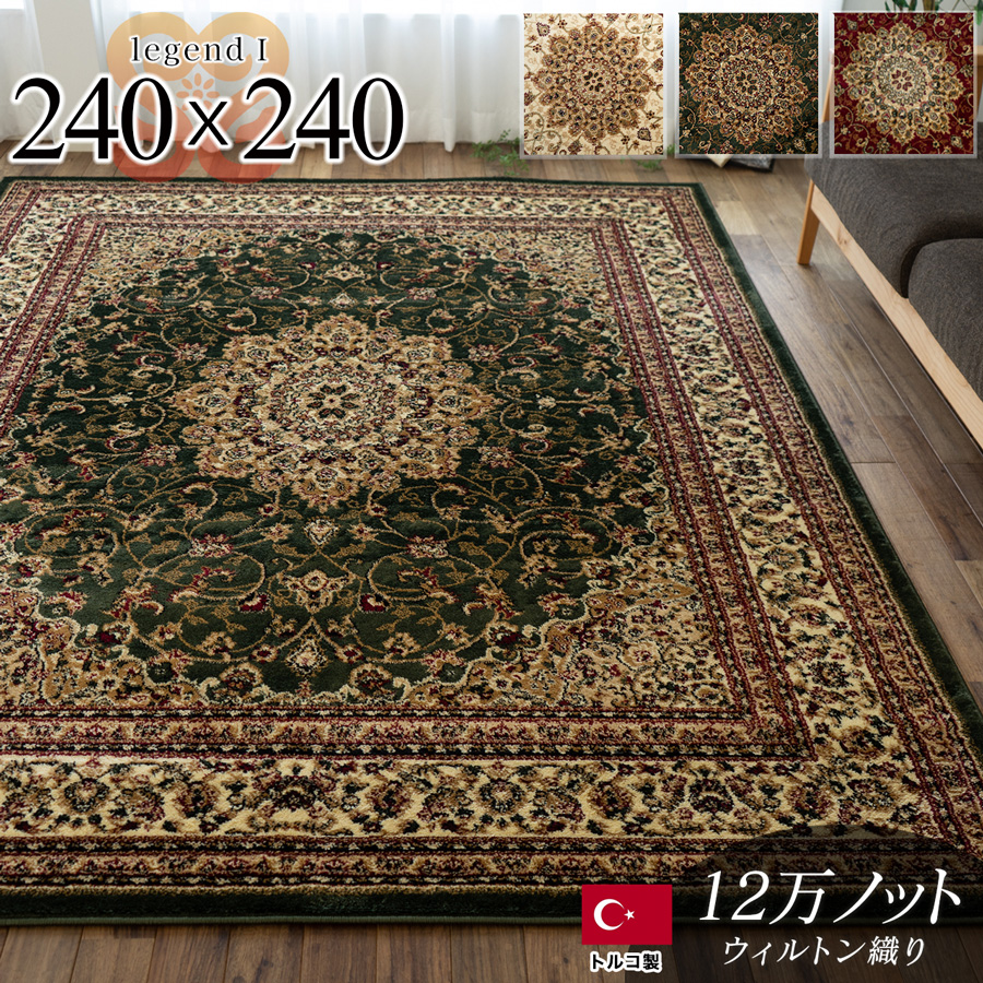 "見た目は豪華で、価格はお手頃" ペルシャ絨毯で代表的な クラシック・メダリオン柄 お手軽にお使いいただける、高級感ある ウィルトン織りカーペットです。 サイズ 240x240 cm (約4.5畳サイズ) ![]() トルコ製『ウィルトン織り』カーペット 伝統的なペルシャデザイン 「メダリオン・デザイン」 メダリオンの豪華に見えるデザインは、 高級感ある色使いです。 是非、一度手にとってご覧いただきたい カーペットです。 カラー: グリーン ![]() " 織りの密度は128,000ノット " ウィルトン織りカーペットの中では、お手軽な カーペットになります。 素材には(ポリプロピレン:100%)を使用。 繊維にはヒートセット加工を施しているので、 肌触りが気持ちよく仕上がっています。 さらにヒートセット加工の特徴として繊維に 熱処理加工を施すことから、形態や寸法安定性を 保つようにする効果もあり、表面が柔らかく、 滑らかで、遊び毛が出にくい仕上がりに、 なっているのも特徴です! ![]() "高級感ある上品で豪華な色使い" 上品な淡いベージュ色を使い、曲線までを 細かく織り込み丁寧にデザインを表現しています。 ![]() ![]() "一年を通して、お使いいただける絨毯" カーペットの厚みは、約10〜11mmの厚みです。 パイル長は、約9mmで細めのパイルを使用して いますので、それほど厚みを感じる タイプではありません。 さらに冬場には床暖房やホットカーペットカバーにも お使いいただけ、暖かい季節には、肌触りもよく、 とても心地良いカーペットです! ![]() お部屋をお手軽に模様替え ![]() カラー: レッド ![]() 深みのある落ち着いたお色の"レッド" 要所要所の細かな柄には、多色の色糸を 使用したりと、濃い色と薄い色のコントラスが 鮮やかな表情で、非常に綺麗に仕上がっています。 ![]() レッドとベージュのお色の組み合わせが、高級感を演出 ![]() ![]() お手入れ方法 ![]() カラー: ベージュ ![]() 伝統あるデザインを明るめの色合いで表現した"ベージュ" ペルシャ柄に優しいベージュカラーを組み合わせることで、 主張しすぎず、落ち着いたデザインになっています。 ![]() ![]() ![]() ![]() 選べる3色展開 多色の色糸を使った『トルコ製 ウィルトン織り』カーペット。 インテリアに合わせてお選びください。 ![]() "見た目は豪華で、価格はお手頃!" コストパフォーマンスの、とても高いカーペットです。 伝統ある『ウィルトン織り・ラグ』の良さを 感じていただけましたでしょうか? リビングマットとしてはもちろん、耐久性もあり、 サイズは240×240cm (約4.5畳サイズ) ※表示サイズより数cmの誤差がある場合がございますので、ご了承ください。 ※当店は通常、おもに同業他社に卸販売を行っております。 在庫は豊富にご用意しておりますが、突然の品切れの場合もございますのでその際はメールにてご連絡させていただきます。 |