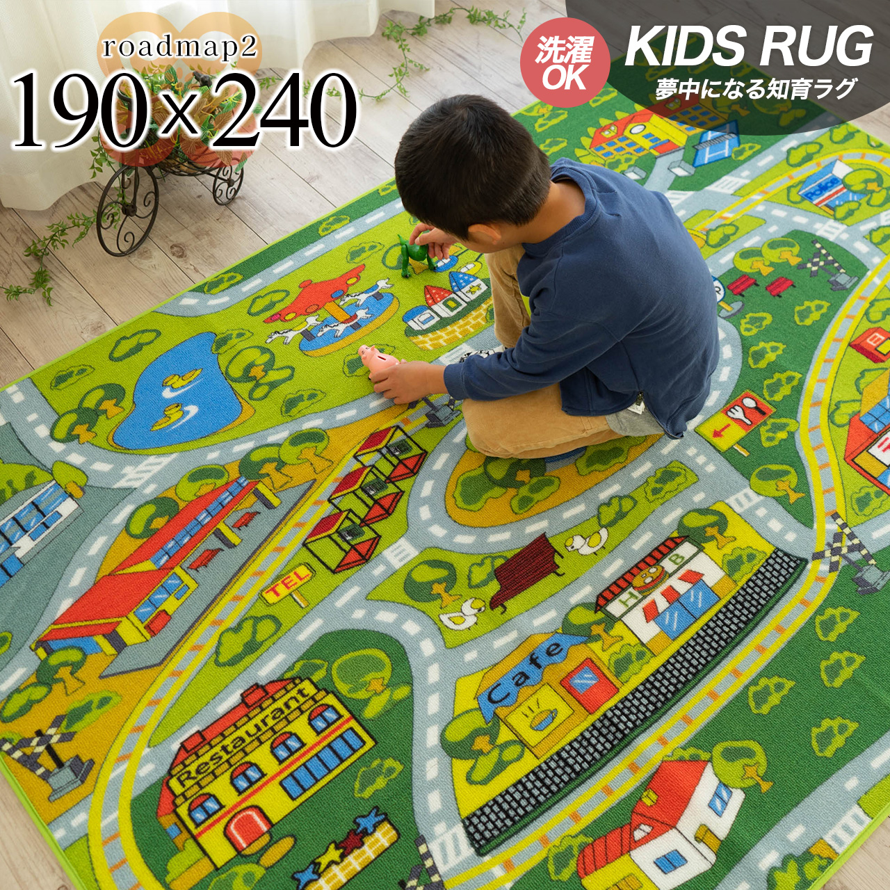 大人気!楽しく遊べるキッズラグ 男の子が大好きなデザイン! お部屋に敷けば、そこはお子様だけの特別空間♪ "ロードマップ・ラグ" 公園や学校、遊園地など 身近にある場所をデザインしました。 さらに、ご家庭で丸洗いOK"で お手入れも簡単 サイズ 190×240 cm (約3畳 大サイズ) 卸通販価格!安心の「税込プライス」 さらに全国送料無料(一部地域を除く)でお届け。 ![]() "お子様が主役になれるロードマップラグ" デザインは、男の子に大人気のトミカや プラレール、トーマス電車で遊びやすい "ロードマップ"デザインです。 さらに、お店や学校などの建物は実際に子供達の 意見を元にデザインし、お子様目線で 遊びたい" と思える仕上がりになっております。 子供達自身が、自分だけのオリジナルタウンで 遊ぶことで遊びの幅が広がり、 ちょっとした "きっかけ"や"思いつき"から 想像力を育む ことができます! さらに夢中になって遊ぶお子様の横で、 パパもママも自由な時間ができ、家事にも 専念できること間違いなしですね。 親御さんが自宅で使う用だけでなく、おじいちゃん、 おばあちゃんからのプレゼントでもきっと お孫さんに喜ばれるラグです! ![]() "お子様におすすめの色合いで作りました" ラグ全体のイメージを自然溢れる公園をイメージし "グリーン"をベースにラグを作りました。 グリーンの色は、安心感や調和を表す色に 使われることが多く、木や森などの自然を イメージする色でもあり、気持ちを 穏やかにするとも言われています。 お子様が、自宅でいつでも身近に自然を感じれる 遊びをすることで、優しい気持ちで 穏やかさを育むことができます。 ![]() 遊びたくなるデザイン "夢がたくさん詰まった自分だけのタウン" 中心には、噴水広場があり、可愛くデザインされた 公園、学校、お店などを配置。さらに道路や、 線路などもあり、 遊びの幅がさらに広がります! また、線路はプラレールなどと、同じ感覚で 遊べるようにループタイプのデザインに しており、お子様も途切れることなく 電車を走らせていただけます。 大好きなトミカや、プラレールでずっと 遊んでいたいと思えるような デザインに仕上がっています。 ![]() ![]() 遊びやすい道路・線路サイズ "いつでもすぐに遊べる道路や線路" 人気のミニカーや、電車のおもちゃ幅に 合わせやすく作られています。わざわざ線路を 組み立てることもなく、ラグを敷いているだけで、 お部屋を散らかさず、いつでもすぐに 遊び始めれます。 ![]() "カーペットの機能にもこだわりました" 表面の素材には厳選された『ナイロン』を使用。 (ナイロン素材 100%) ナイロン素材を使用することで、摩擦に強く 色あせにくいため耐久性が高いのも魅力です。 肌の触れる表面は素材を活かした、 ループパイルを使った本格ラグです。 ![]() さらに"ロードマップ"は、 ナイロン素材とループパイルを組み合わせたことで、 遊び毛が出にくい仕様となっているのも特徴です。 お子様が、ラグの上で寝転んだり、ラグの上で車を 走らせたりしても摩擦に強いことから、 遊び毛が出にくいので安心です。 遊び毛が出にくいと、お掃除も楽なので 家事も減って助かりますね。 ![]() " 1年を通して、お使いいただけます " 上記画像にもあるように、ラグの裏面には床を 傷つけにくいように不織布の加工を施して いますので、フローリングの傷なども安心です。 また、重さも軽めに仕上がっており、女性の方でも 扱いやすくお部屋の移動などもしやすい1枚と なっております。 冬場には床暖房やホットカーペットカバーに対応 しているので、リビングや子供部屋に そのまま敷いたまま1年をお過ごしいただけます。 各サイズ毎のデザイン ![]() お手入れ方法 万が一、ジュースをこぼしたり汚れた場合でも、 ご家庭で"洗濯機で丸洗い"できるので、安心です。 ![]() ![]() お客様レビュー ![]() ![]() 大人気のお子様が主役で遊べるラグ ロードマップ・ラグ お子様の遊びの幅が広がり、夢中になれるラグ! お子様が、"遊びたい"と、思えるのはもちろんのこと ご自宅で、お洗濯もできてお手入れもしやすい 本格ラグです。 お求めやすい価格で、ご家族皆様に おすすめの1枚です。 サイズ 190×240 cm (約3畳 大サイズ) ※表示サイズより数cmの誤差がある場合がございますので、ご了承ください。 ※当店は通常、おもに同業他社に卸販売を行っております。 在庫は豊富にご用意しておりますが、突然の品切れの場合もございますのでその際はメールにてご連絡させていただきます。 |