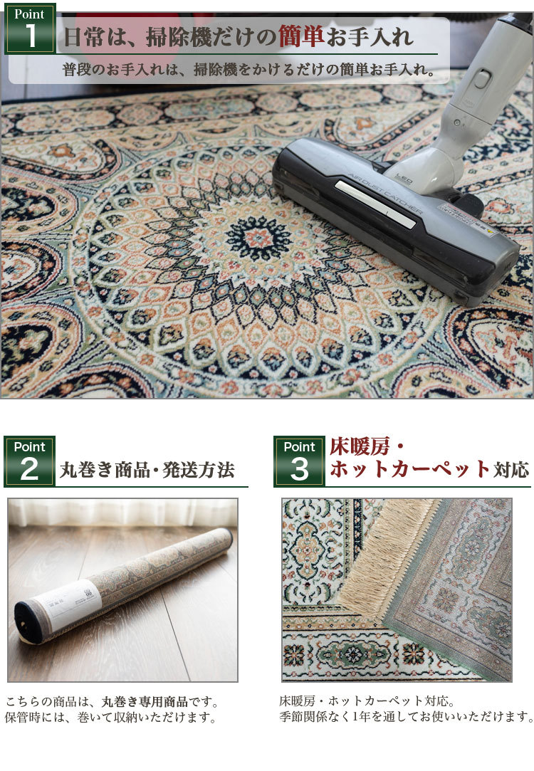 | 【こちらの商品の梱包方法】 ・丸巻き ※商品は開梱時、ラグマット、カーペットの毛並みにムラなどがございますが、使用するにつれ、なくなります。 ※商品によりサイズに多少の誤差があります。 ※カラーはディスプレイ上、実際の色と多少異なる場合がございます。 ※こちらの商品は気になる遊び毛などは出にくいつくりとなっております。 ※滑りやすい場所でのご使用は市販のカーペット用の滑り止めネットのご使用をお勧めします。 ※汚れた場合は、カーペットクリーナー、中性洗剤などを薄め固く絞ったタオルなどで拭き取ってください。 | |