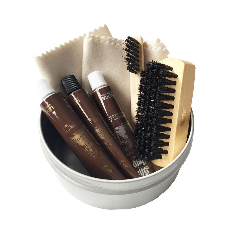 乳化性靴クリーム(クロ・ムショク)、靴クリーナー、ブラシ2個、テレンプ(磨き布)が缶に入ったお得なお手入れセットです。