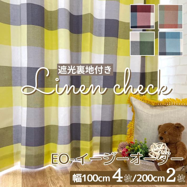 EO-遮光裏地付リネン調 ナチュラル チェック カーテン &レースカーテンセット 幅100 or 200cm×丈80~250cm イージー オーダー