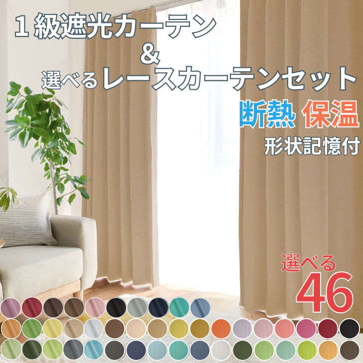 カーテン 1級遮光 イージーオーダー EO-ソリッド24色 パレット22色 1級遮光カーテン&選べるレースカーテン 4枚セット 2枚セット 断熱 保温 形状記憶付