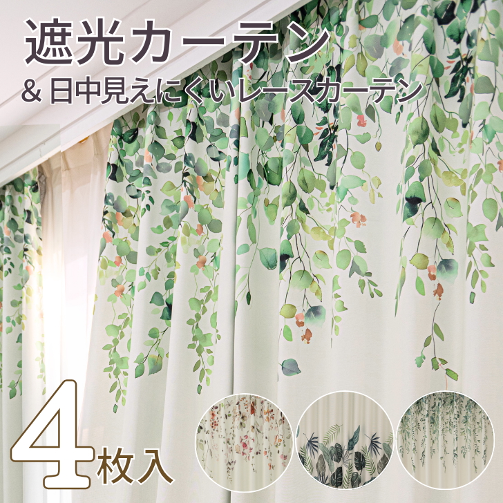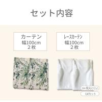 カーテン 4枚セット 遮光 ナチュラルな絵羽デザイン 選べる 遮光カーテン&ミラーレースカーテン 幅100cm(4枚) 丈135 178 200cm ボタニカル 爽やか
