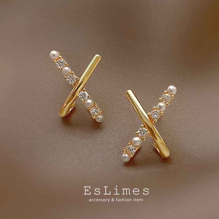 ピアス レデイース X型 パール キュービックジルコニア 2連風 キラキラ ゴールド 大人可愛い 上品 通販 激安アクセサリー 女性 人気 ポイント利用