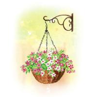 ナチュラルテイストのハンギングバスケット。スチールの内枠付き。内側はビニールシート張りにしています。(底部分には水抜き穴があります。)
