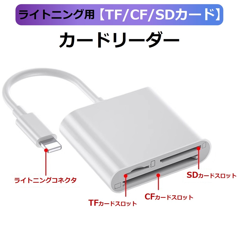 | ・このLightning SDカードリーダーを使って、CFカード、SDカードやmicroSDカードのデータをiPhoneやiPadに直接転送できます。デジカメやビデオカメラで撮影した画像を、わずらわしいネットワーク接続やアプリ不要で直接iPhoneに転送。 |