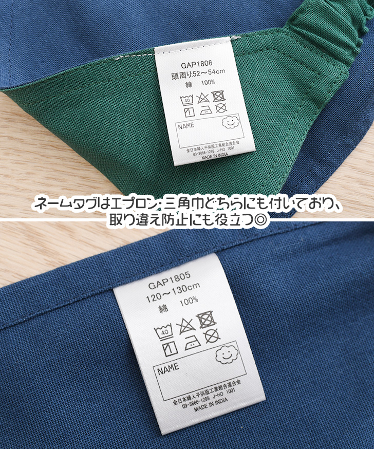 ネームタグはエプロン・三角巾どちらにも付いており、取り違え防止にも役立つ◎