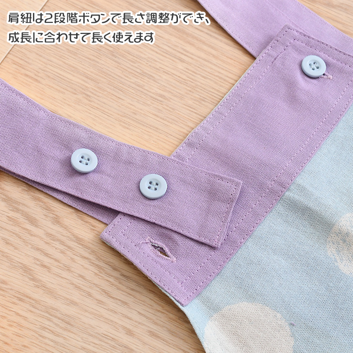肩紐は2段階ボタンで長さ調整ができ、成長に合わせて長く使えます