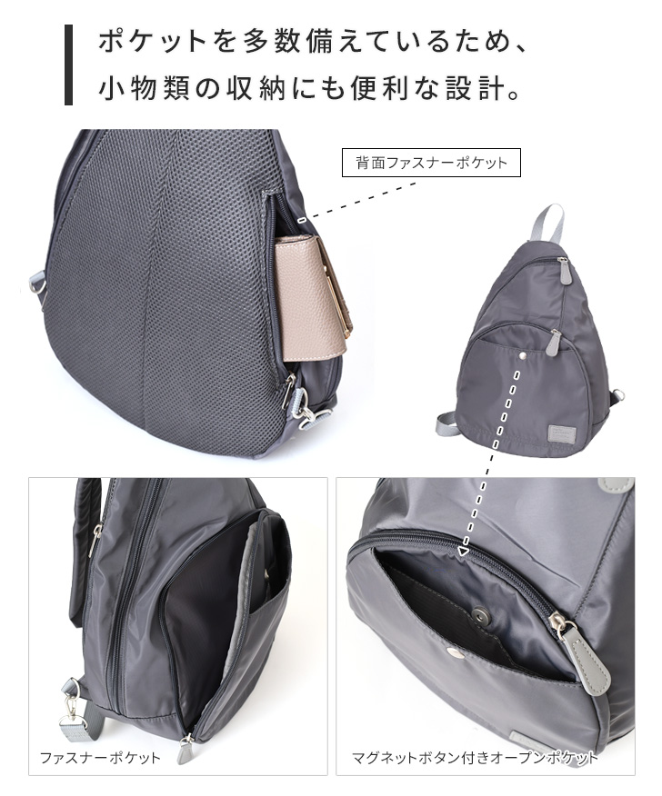 ファスナーポケット×2、マグネットボタン付きオープンポケット×1、背面直結ファスナー×1