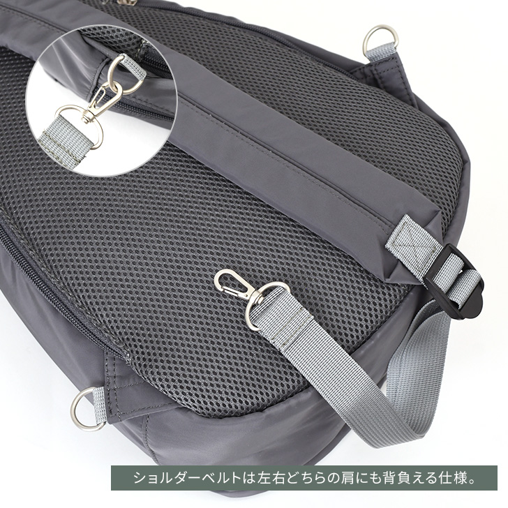 ショルダーベルトは左右どちらの肩にも背負える仕様。