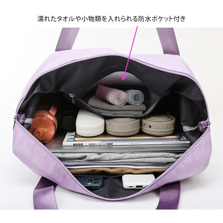 濡れたタオルや小物類を入れられる防水ポケット付き。