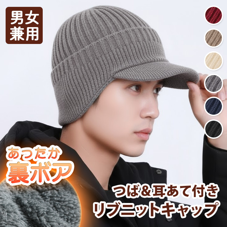 つば&耳あて付き◎あったかリブニットキャップ