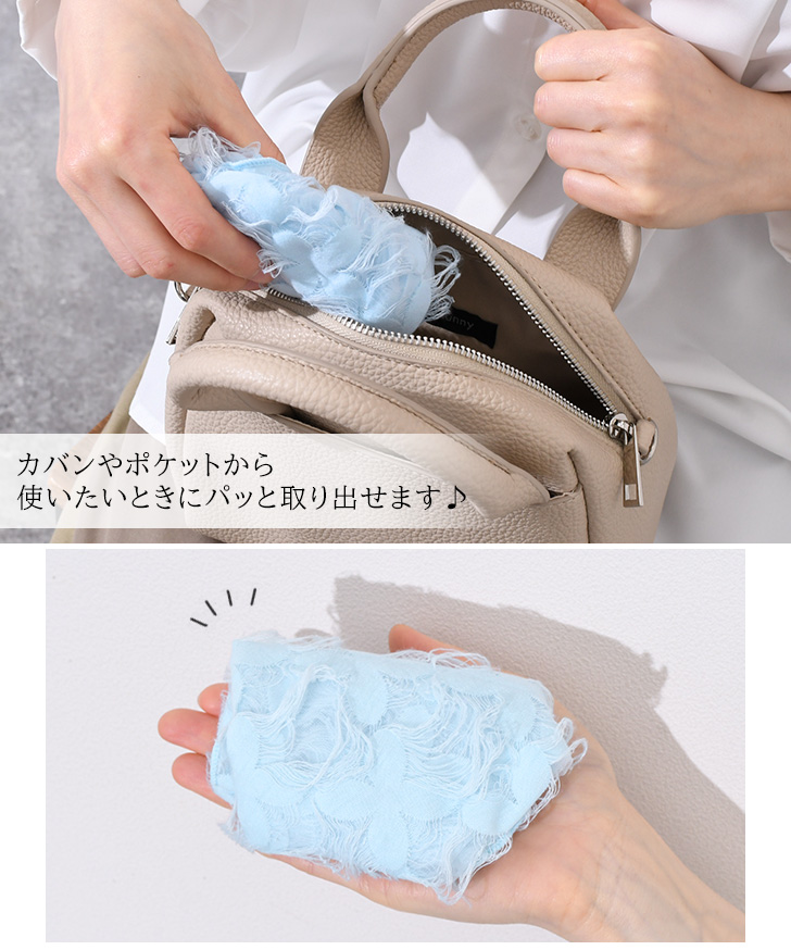 首元や頭に巻いたり、お手持ちのバッグにキュッと結んだり、