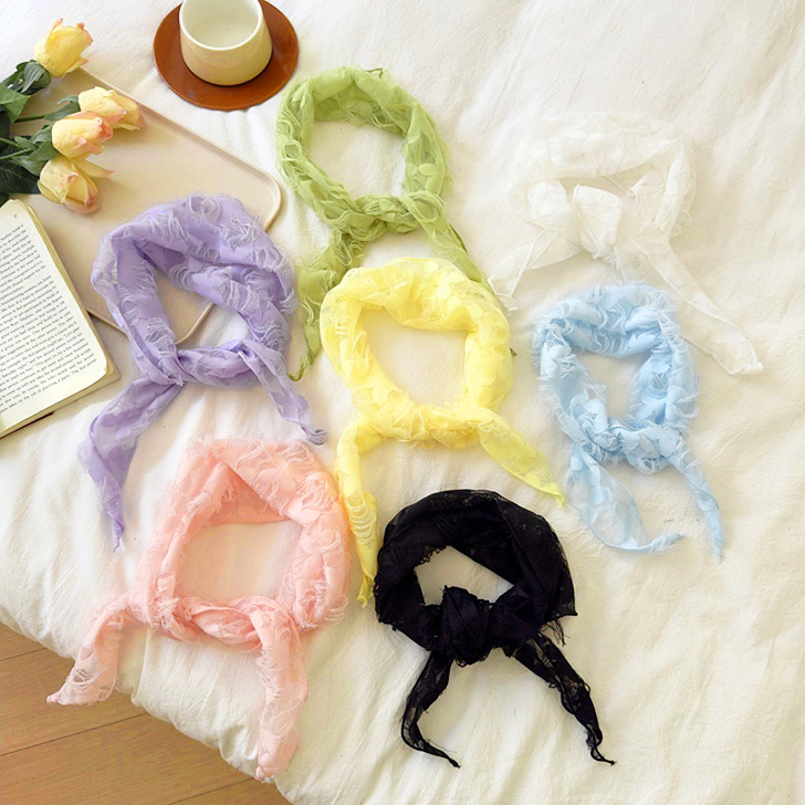 透け感と総柄の刺繍がおしゃれな三角スカーフ