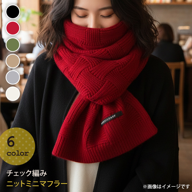 こなれ感のあるチェック編み×タグデザインのミニマフラー