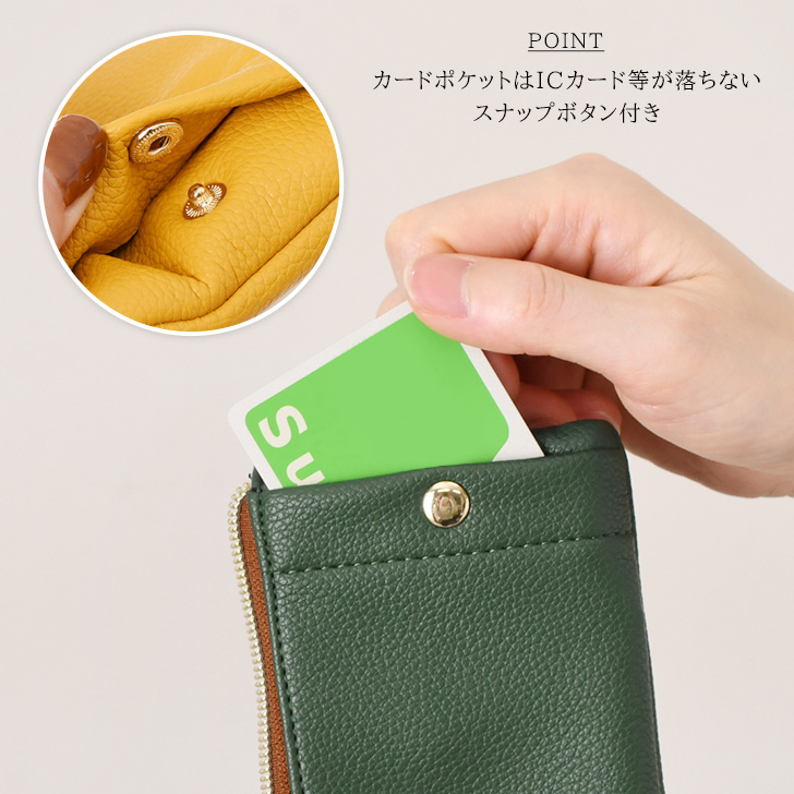 カードポケットはICカード等が落ちないスナップボタン付き。