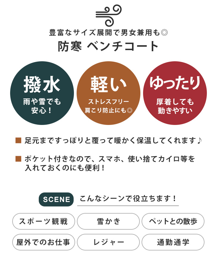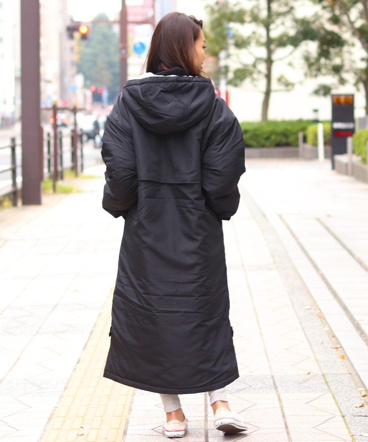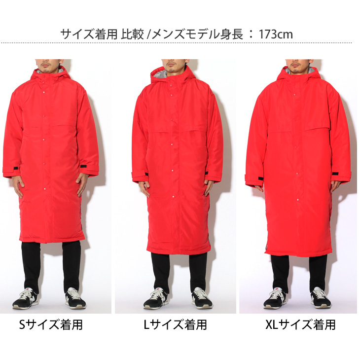 | ▼メンズスタッフ ◆身長172cm/普段トップスS着用 Sサイズでジャストサイズでしたが、全身をゆとりをもって覆ってくれるLサイズを選ぶと思います。 フードも深く被れたのであったかいです。 ▼レディーススタッフ ◆身長151cm/普段トップスS/ボトムS着用 ・試着サイズ:Sサイズ ・着丈:くるぶしの10cm上くらい ・袖丈:指先がほぼ隠れるくらい ・身幅:ゆったり コメント:ゆったりとしたサイズ感だったので、厚手のニットでもかさばらすに着用出来ました。 ◆身長158cm/普段トップスM/ボトムM着用 ・試着サイズ:Sサイズ ・着丈:くるぶしの15cm上くらい ・袖丈:指先が少し出るくらい ・身幅:ゆったり コメント:ニットの上から羽織ってもゆったりと着られました。体全体をすっぽり覆ってくれてとても暖かかったです。 ◆身長165cm/普段トップスL~LL/ボトムL~LL着用 ・試着サイズ:Lサイズ ・着丈:くるぶしの5cm上くらい ・袖丈:手がすっぽり隠れるくらい ・身幅:ゆったり コメント:長さがあり、ゆとりがあるのでLサイズを選びます。厚手のパーカーの上からでもゆとりを持って着られました。 |
