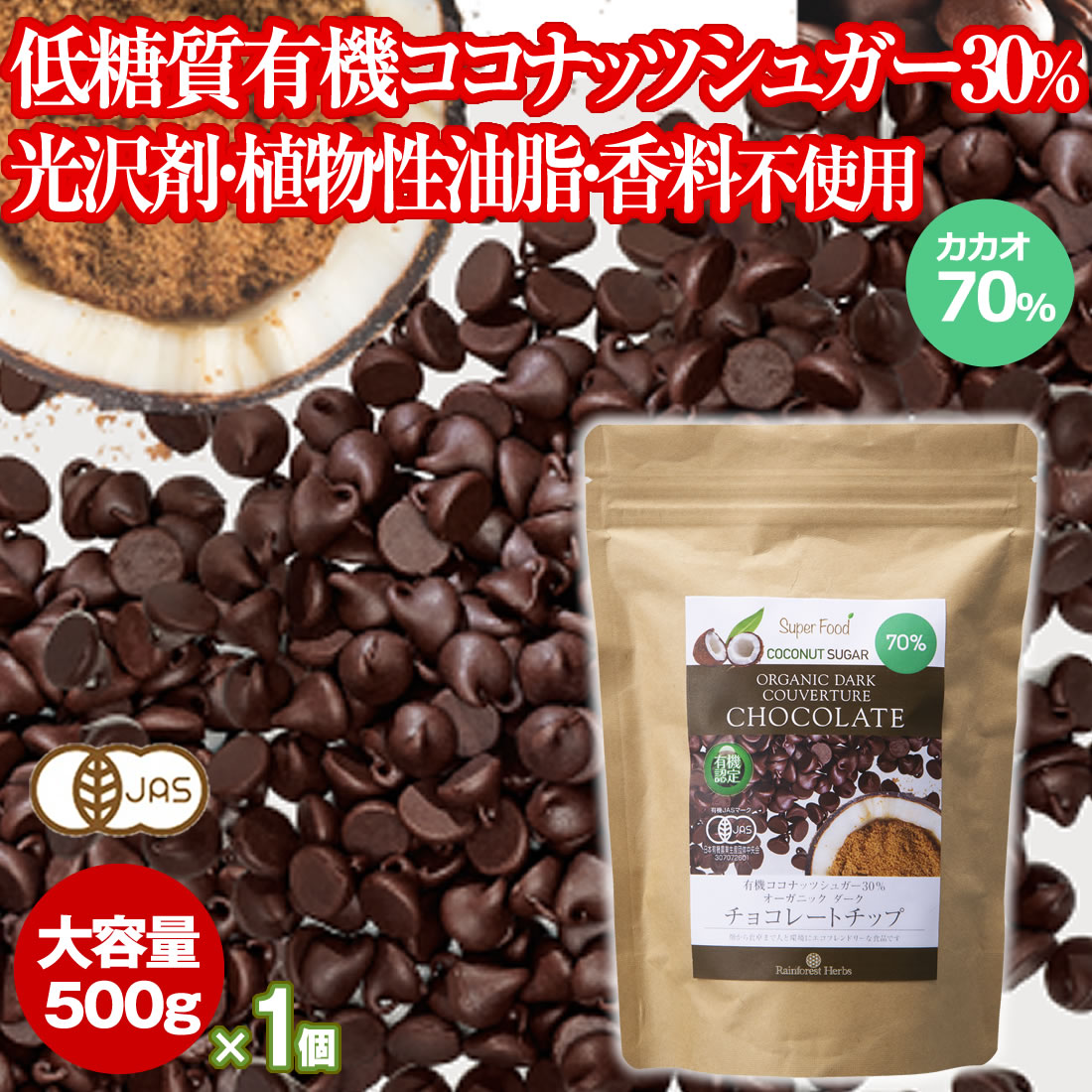 ダイエットの味方 チョコレートチップ ペルー産有機カカオ70% クーベルチュールチョコレート 有機ココナッツシュガー 500g 1袋 オーガニックダークチョコ