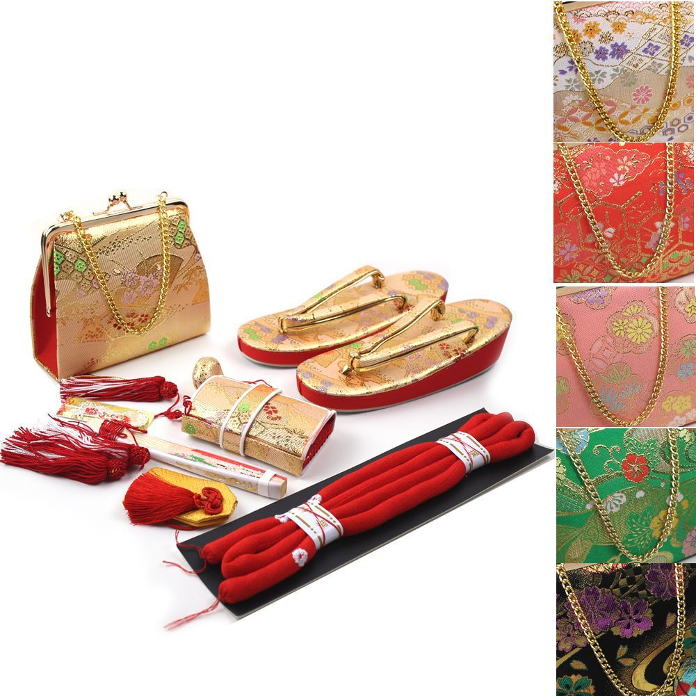 (寸法)バッグ:横15.5cm 縦14cm マチ5cm草履:長さ21cm 7cm かかと 5cm扇子:17cmはこせこ:縦6cm 横10cmビラ簪:7cm帯締め:長さ115cm 太さ1.2cmお守り:7cm×4cm