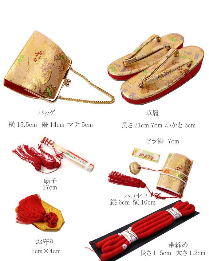 バッグ:横15.5cm 縦14cm マチ5cm草履:長さ21cm 7cm かかと 5cm扇子:17cmはこせこ:縦6cm 横10cmビラ簪:7cm帯締め:長さ115cm 太さ1.2cmお守り:7cm×4cm