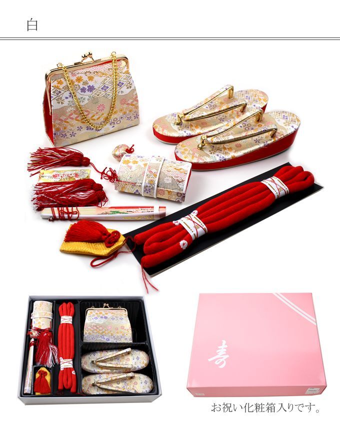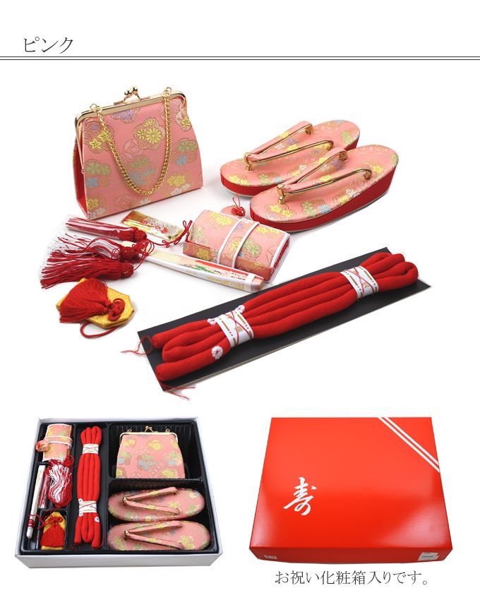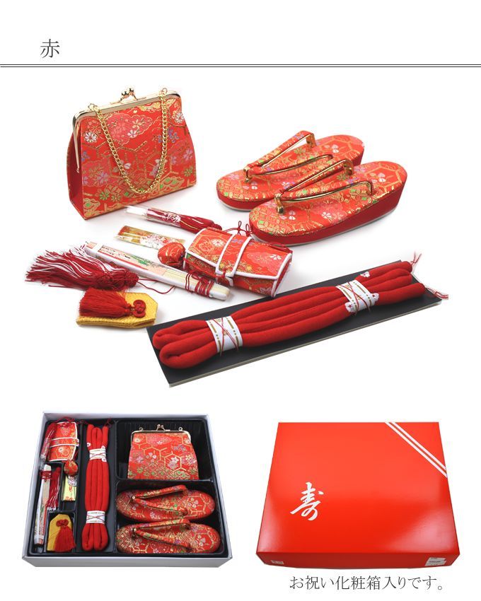 七五三の七歳のお祝いにかかせない箱迫セットです。草履、バッグ、丸ぐけ、扇子、はこせこ、びらかんざし、お守りの小物のセットです。