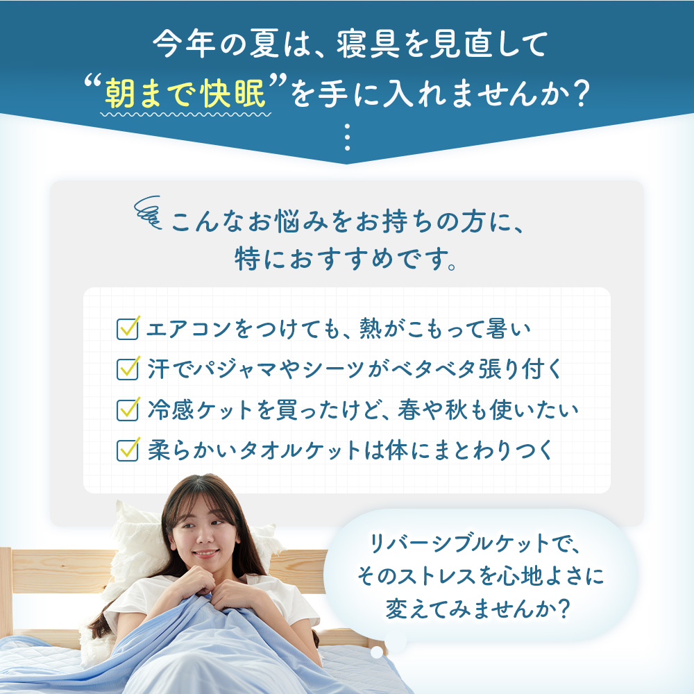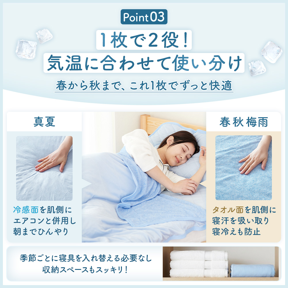 ・暑い夏には冷感面、春と秋は汗を吸い取りすぐに乾くタオル地パイル面を使い分けることで長く快適に使えるおすすめのサマーブランケット。
