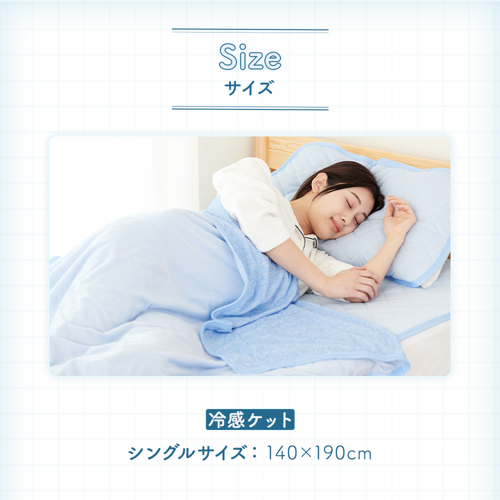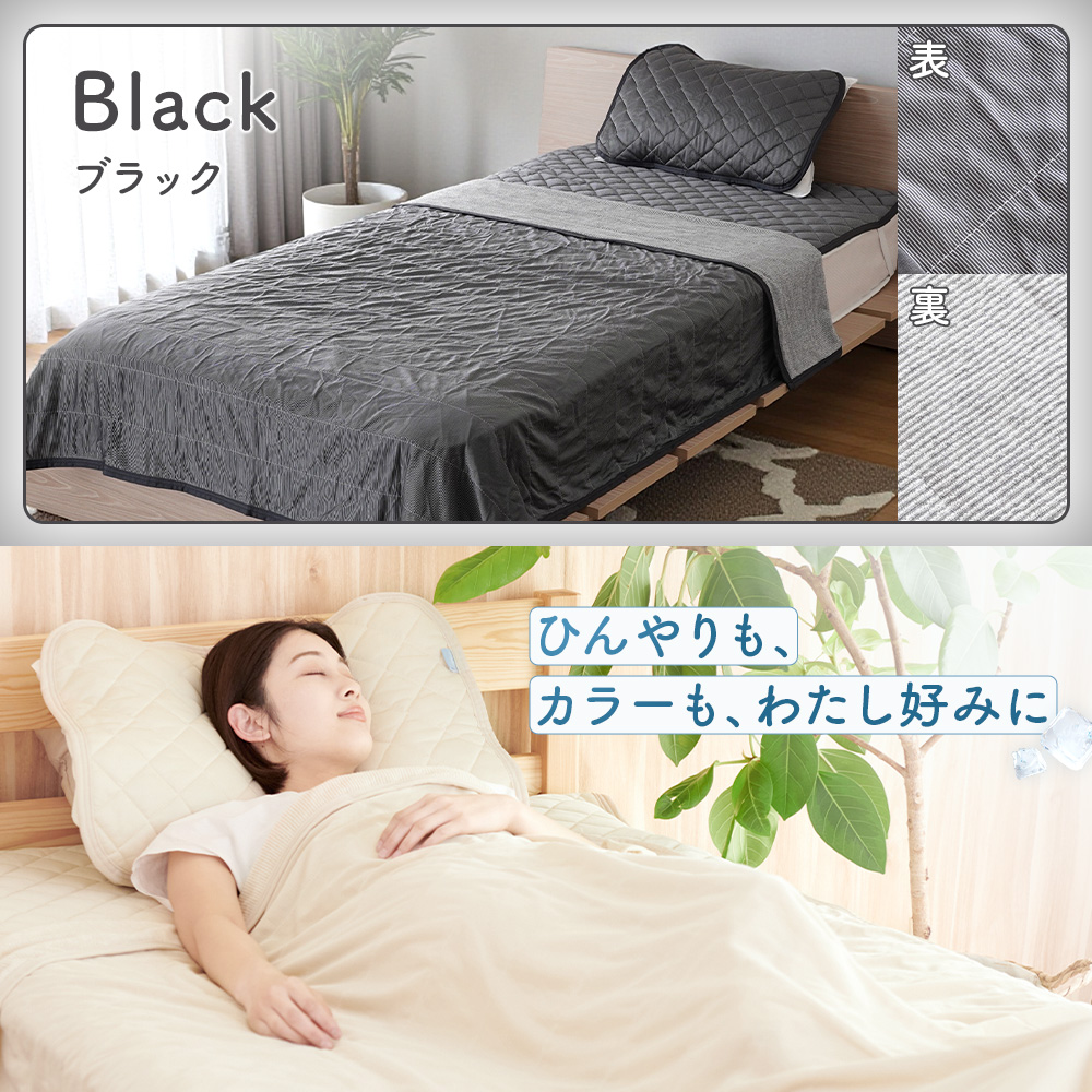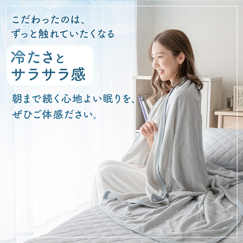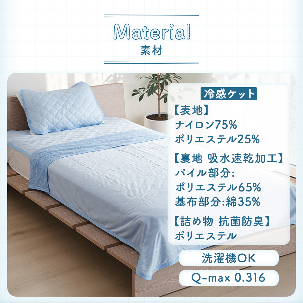 ・接触冷感生地は生地自体が温まってしまうと冷感効果が感じにくくなります。冷房と併用していただくことで冷感効果を発揮します。