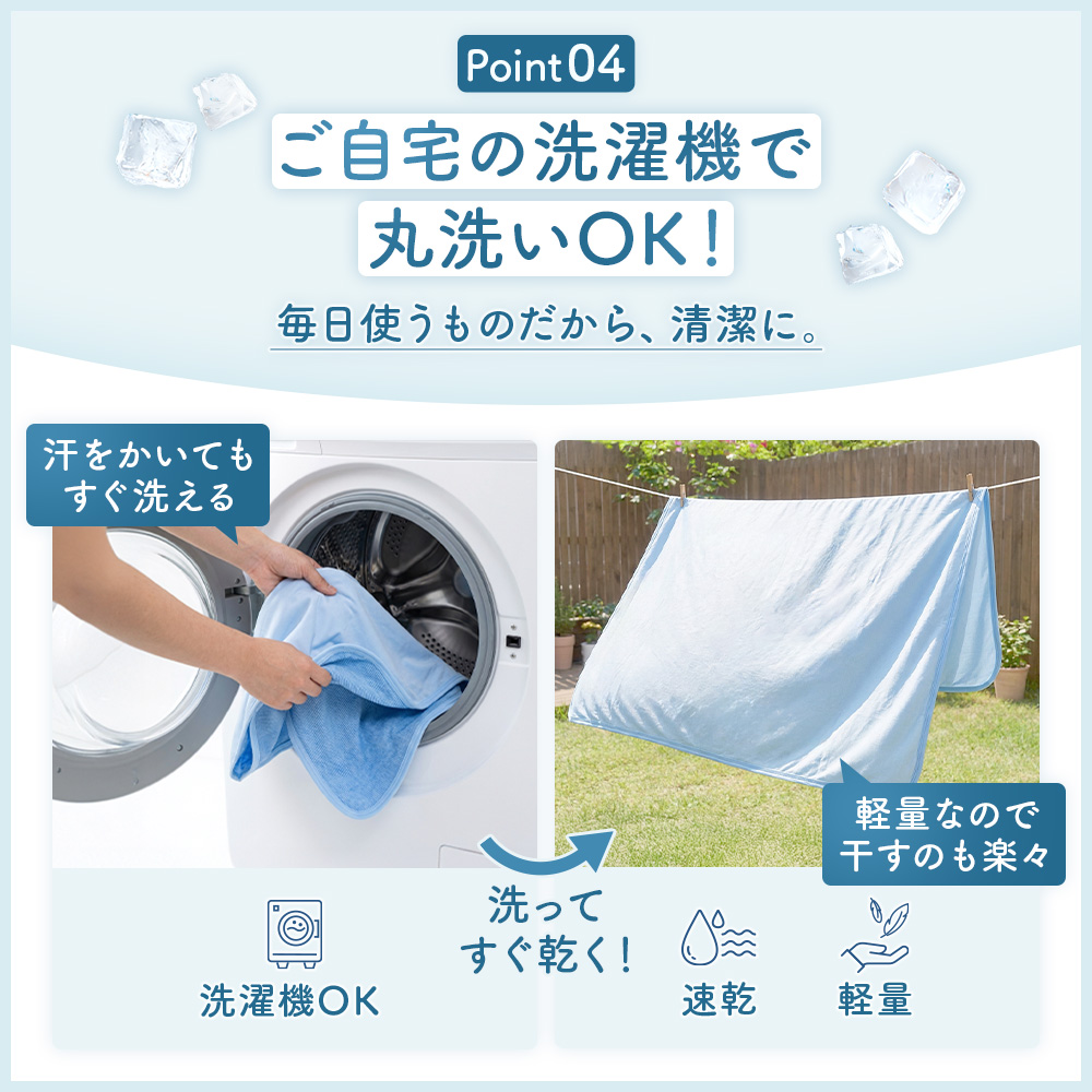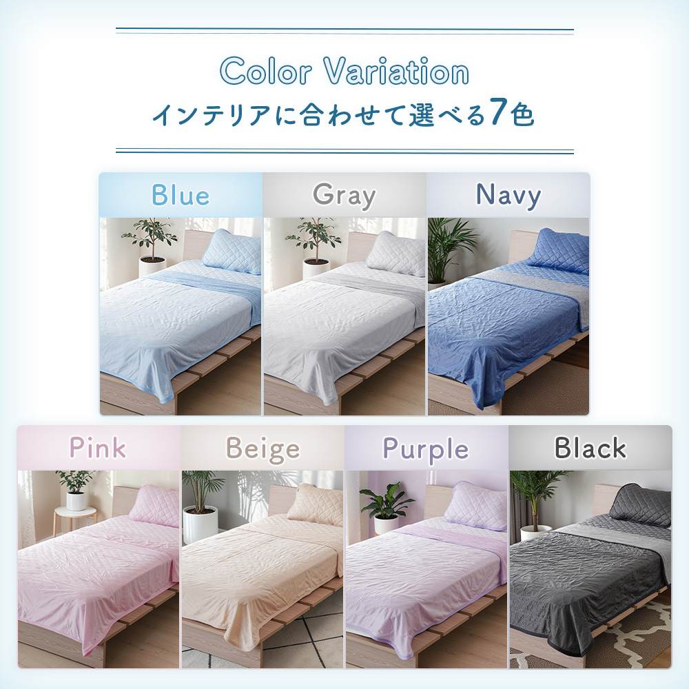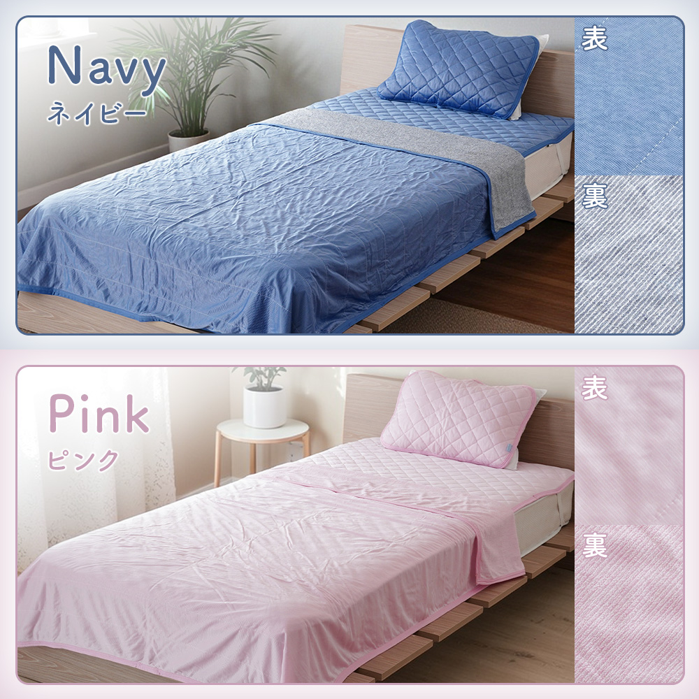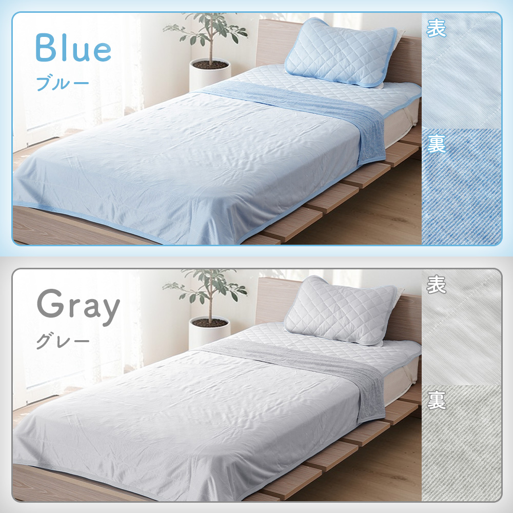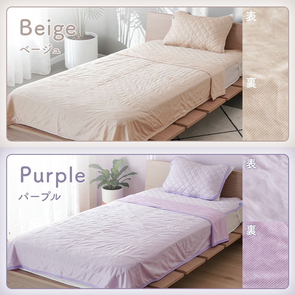 ・接触冷感生地は生地自体が温まってしまうと冷感効果が感じにくくなります。冷房と併用していただくことで冷感効果を発揮します。
