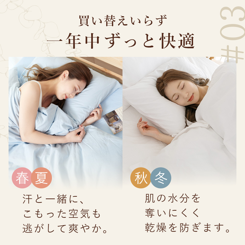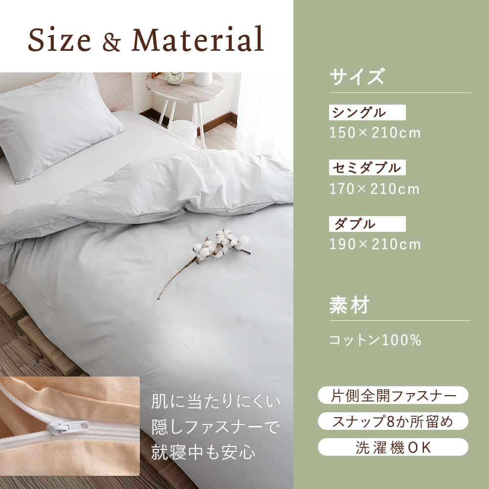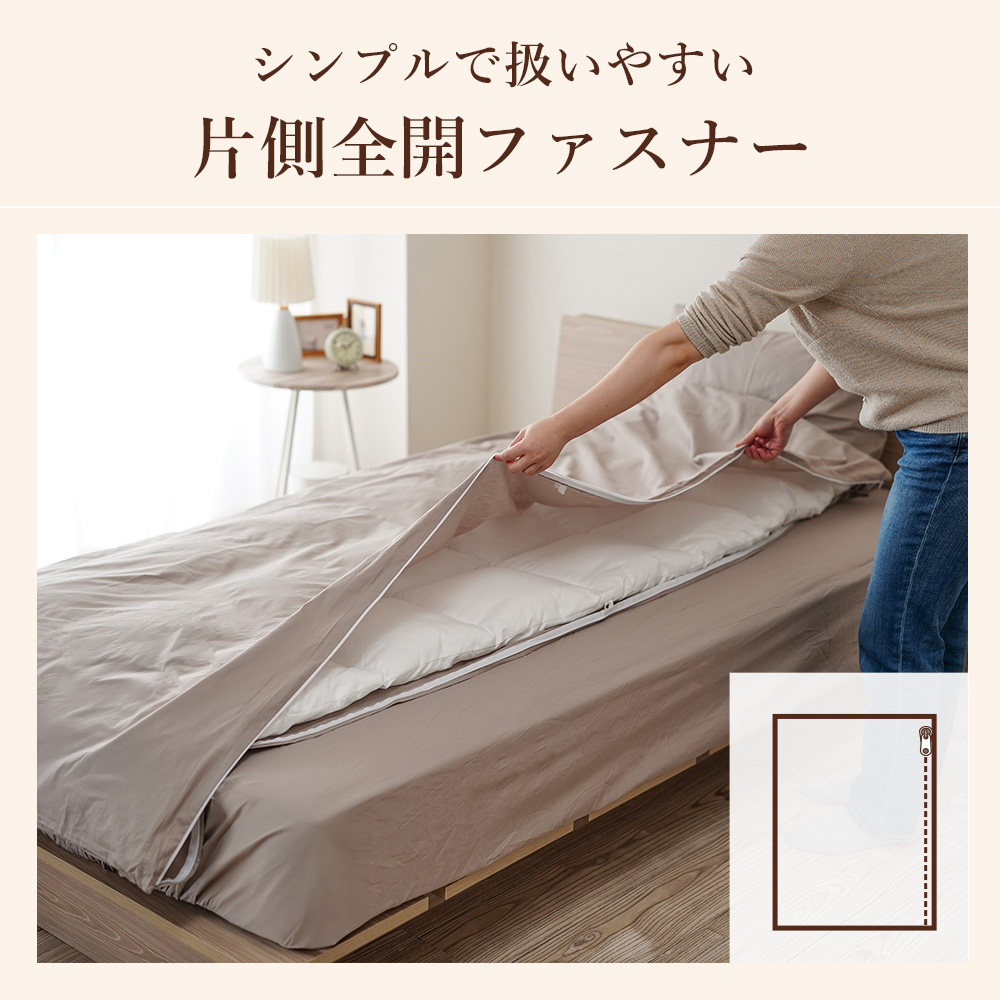 ・ファスナーは端まで開き出し入れ楽々。布団の角をしっかり固定できる8か所留め付きでカバーがずれにくく、吸水、保湿の優れたなめらかな綿は、通年お使いいただけます。