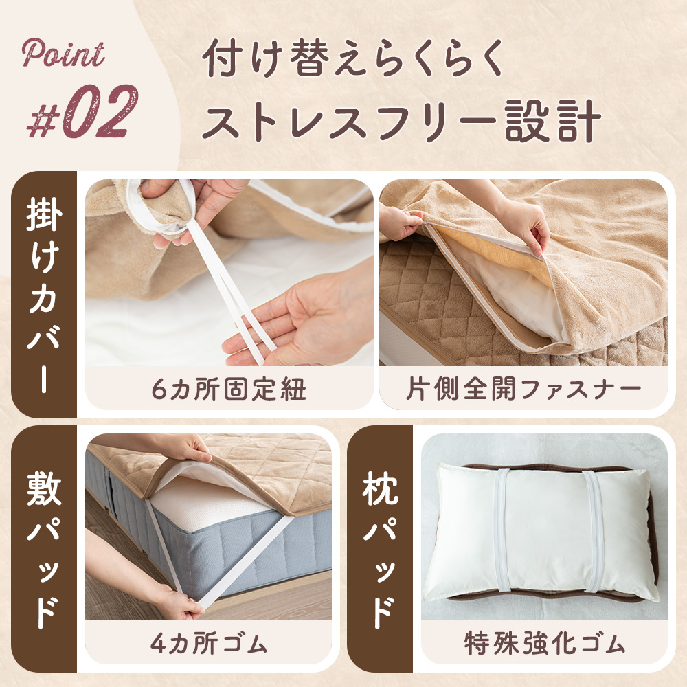 ・敷きパッドは、4か所ゴム付き。強いホールドで朝までズレにくいです。