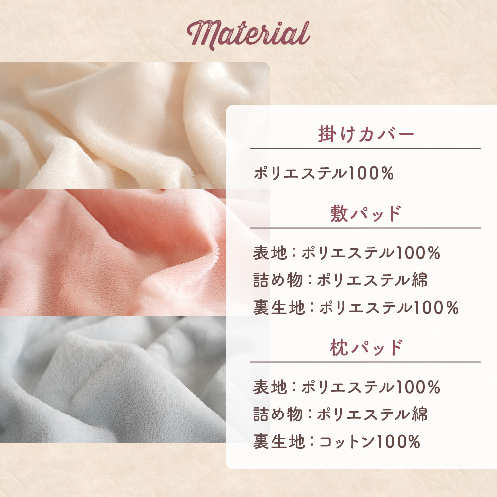 生地:・掛けカバー:ポリエステル100% ・敷きパッド:表地 ポリエステル100% 詰め物 ポリエステル綿 裏生地:ポリエステル100% ・枕パッド 表地 ポリエステル100% 詰め物 ポリエステル綿 裏生地:ポリエステル100%