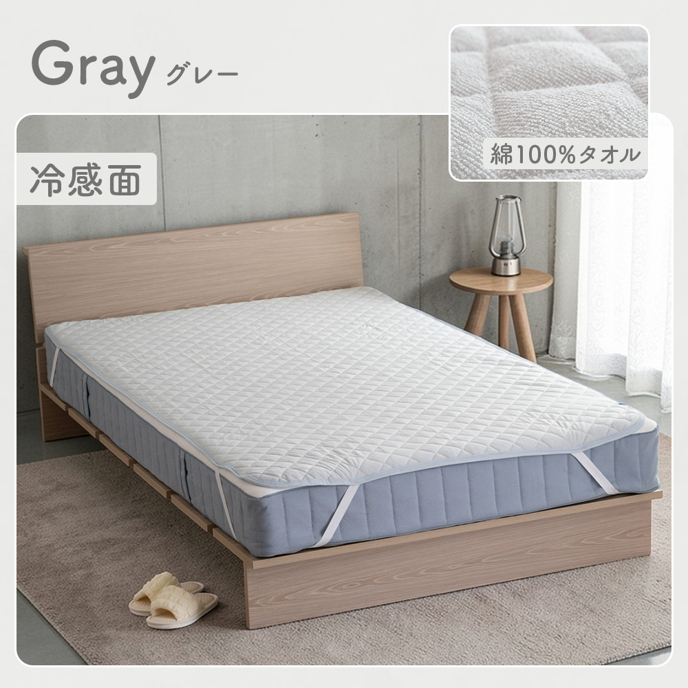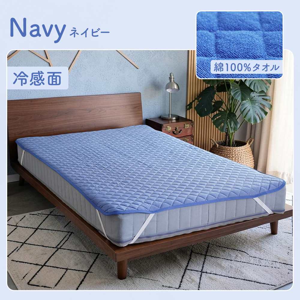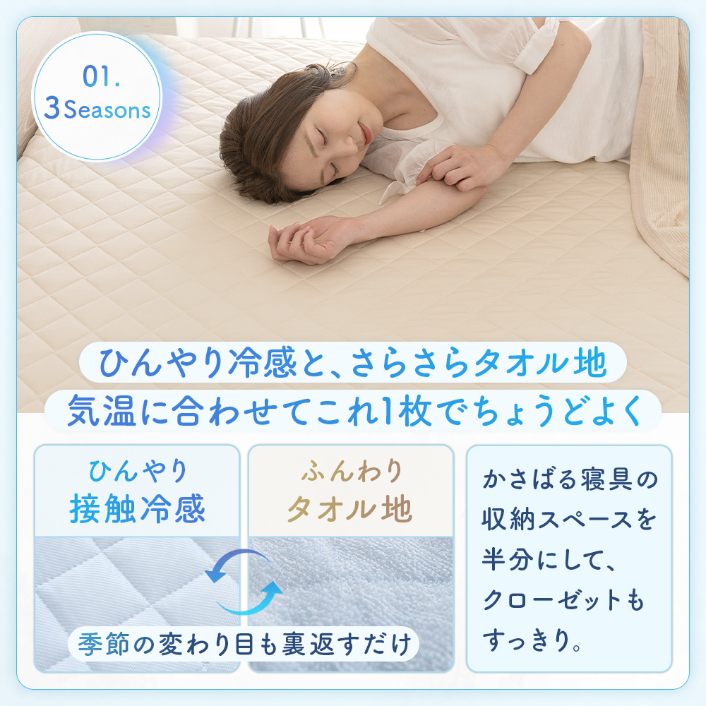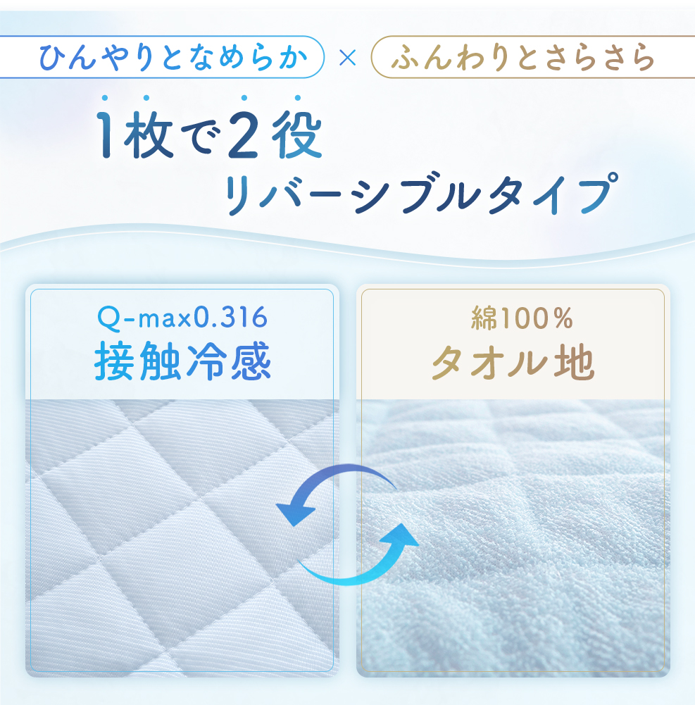 ・冷感とタオル地のリバーシブル仕様。表面はひんやり冷たい接触冷感生地、裏面はさらさら快適な綿タオル地だから、通年使えます。