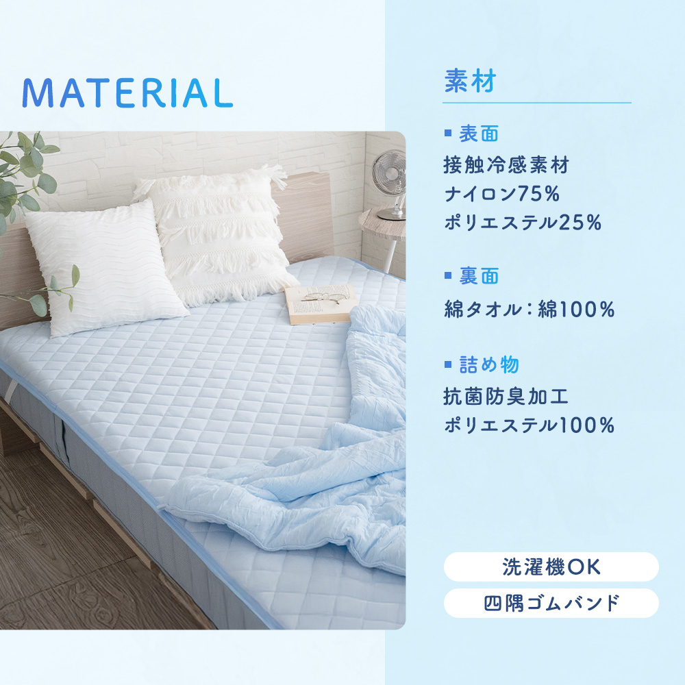 ・熱伝導により触れた部分がひんやり感じる接触冷感素材です。クーラーと一緒に使用していただくと、よりひんやり感じられます。