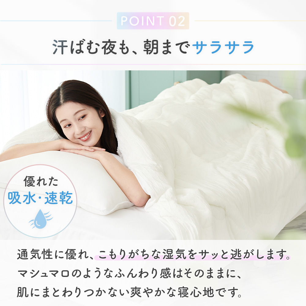 ・まるでマシュマロのようにふんわりとろける肌ざわり。非常にやわらかく伸縮性のあるレーヨン素材で、身体の形状にフィット。吸湿・発散性に優れたレーヨンだから、寝汗も素早く吸収して放出。ムレにくく、朝までさらっとした心地よさが続きます。