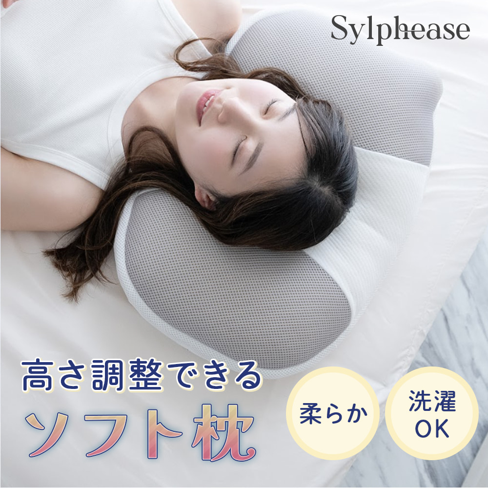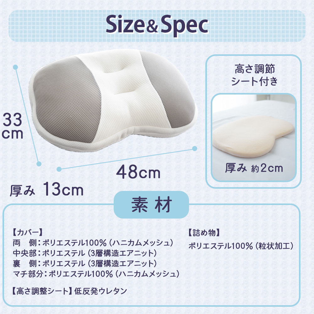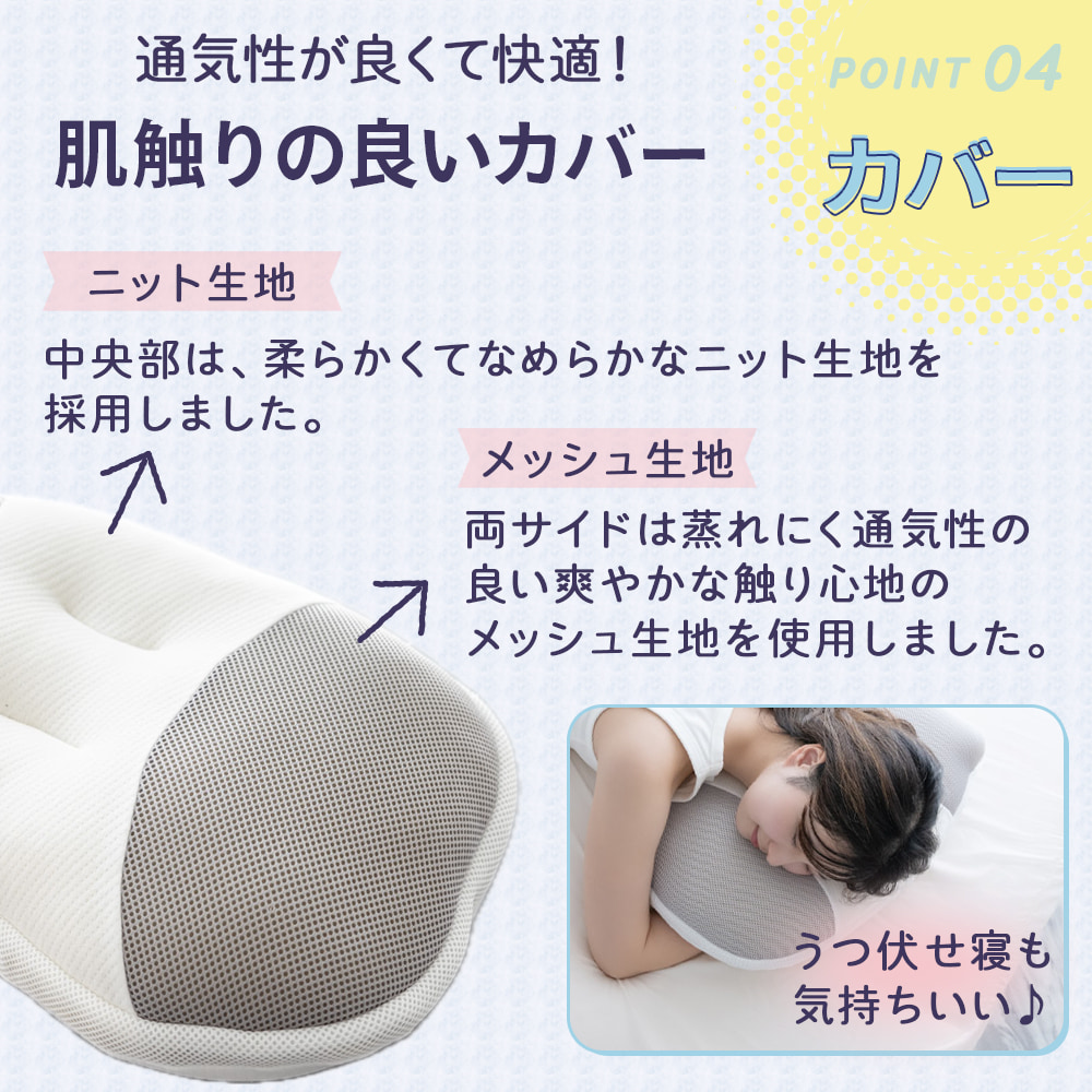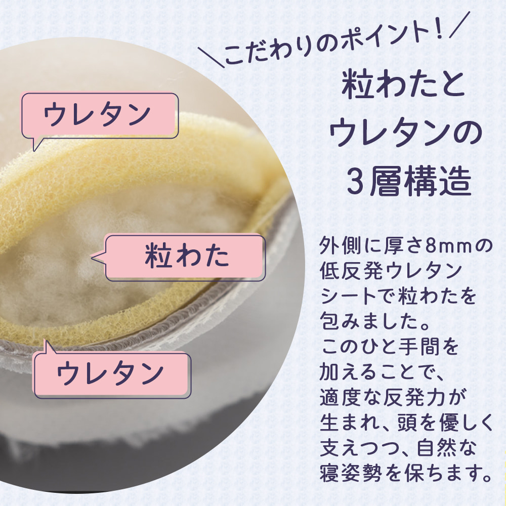 外側に厚さ8mmの低反発ウレタンシートで粒わたを包むことで、適度な反発力が生まれ、頭を優しく支えつつ、自然な寝姿勢を保ちます。